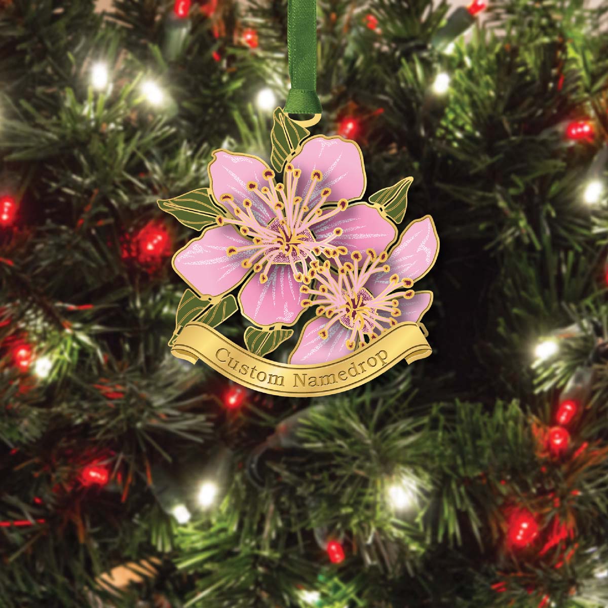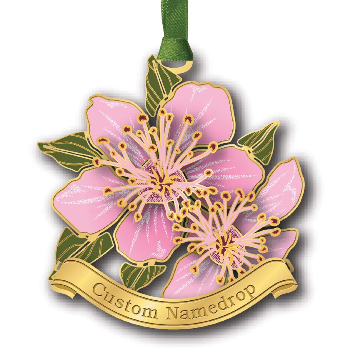 This ‘Cherry Blossoms’ ornament highlights two fully bloomed cherry blossoms. Its unique namedrop banner lets you customize the ornament with your store name or town, turning it into a special keepsake for your customers.