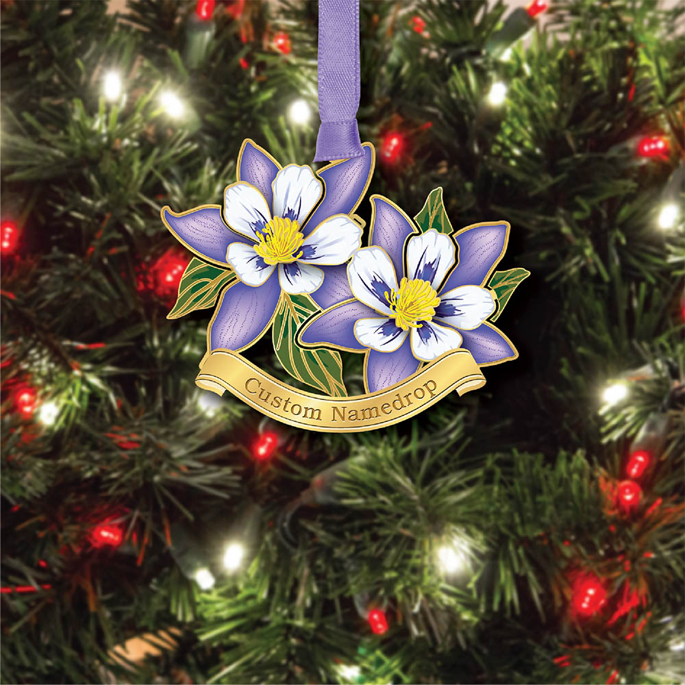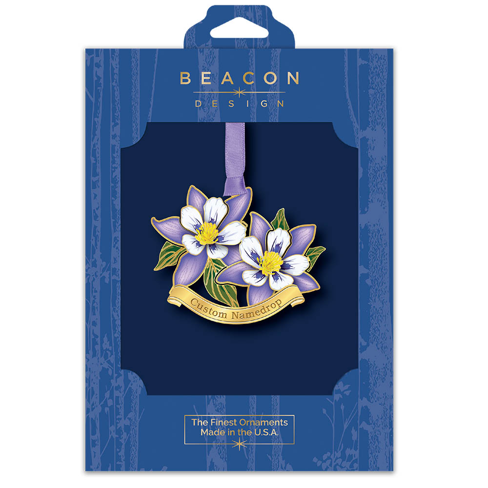 The beautiful purple and white Columbines Namedrop ornament is a great keepsake for customers who love flowers or that want a great souvenir. Add your custom text to the namedrop banner.