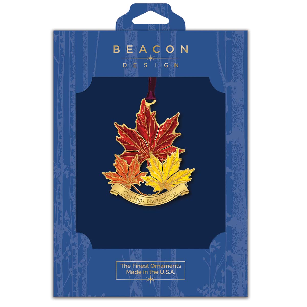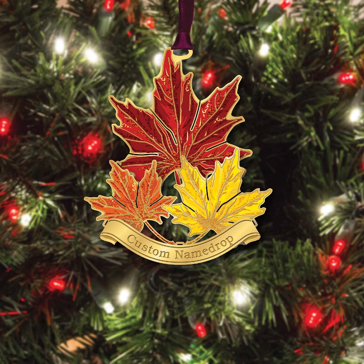 This ‘Maple Leaves’ ornament stunningly captures the vibrant hues of autumn with a collection of maple leaves in their full fall glory. The unique namedrop banner lets you customize the ornament with your store name or town, crafting a unique keepsake for your customers.