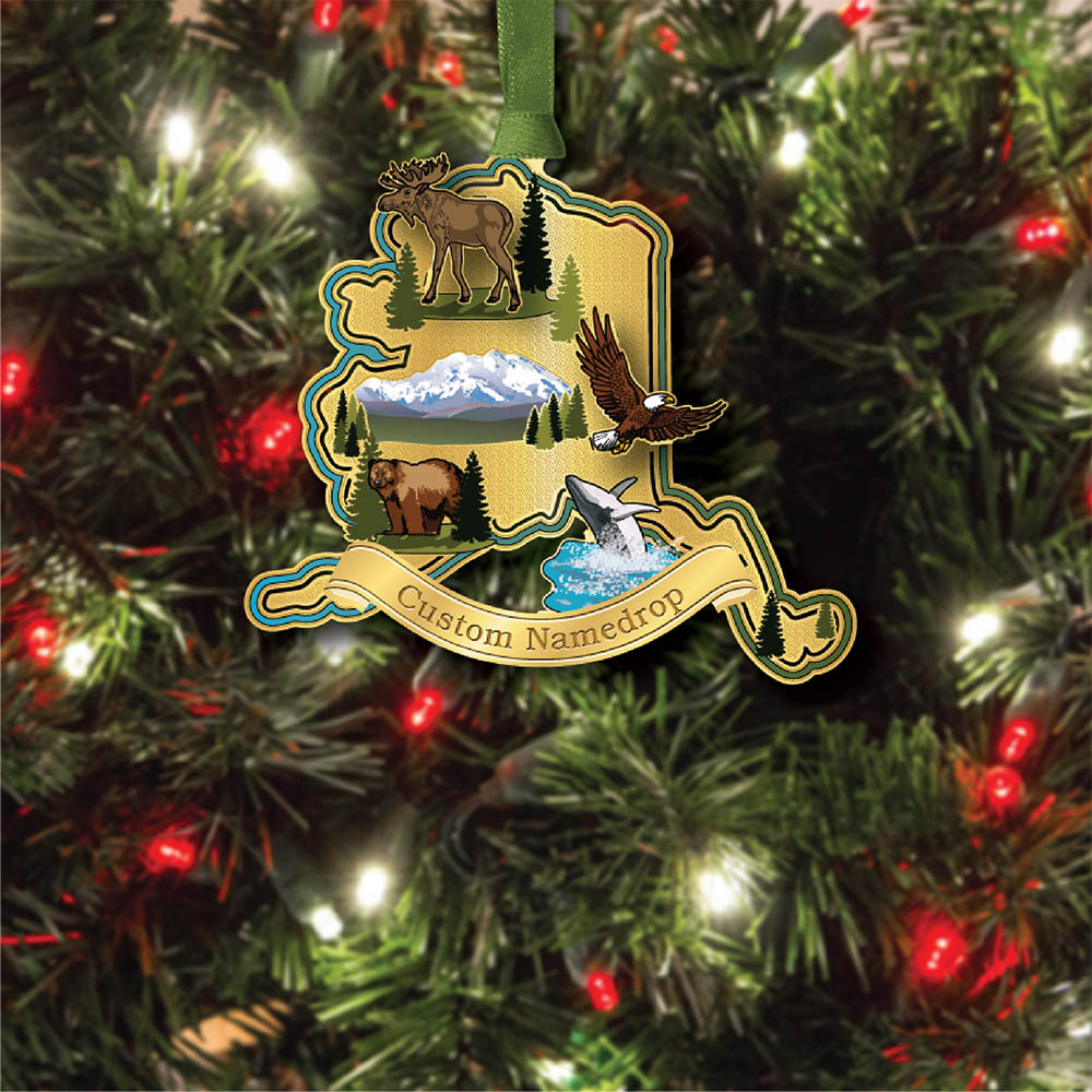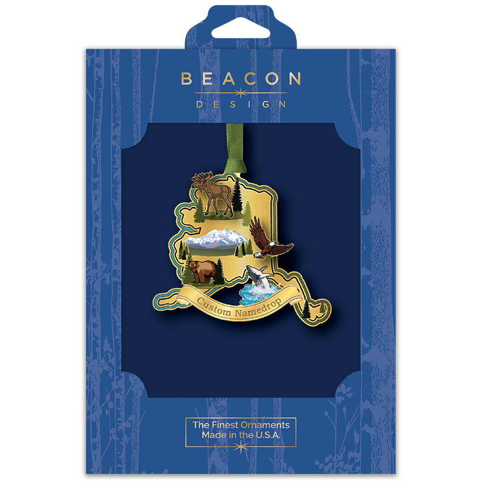 The State of Alaska Namedrop ornament features some of the best wildlife in Alaska, customize it with your location or store name and stock it for your customers to remind them of their favorite Alaska trip.