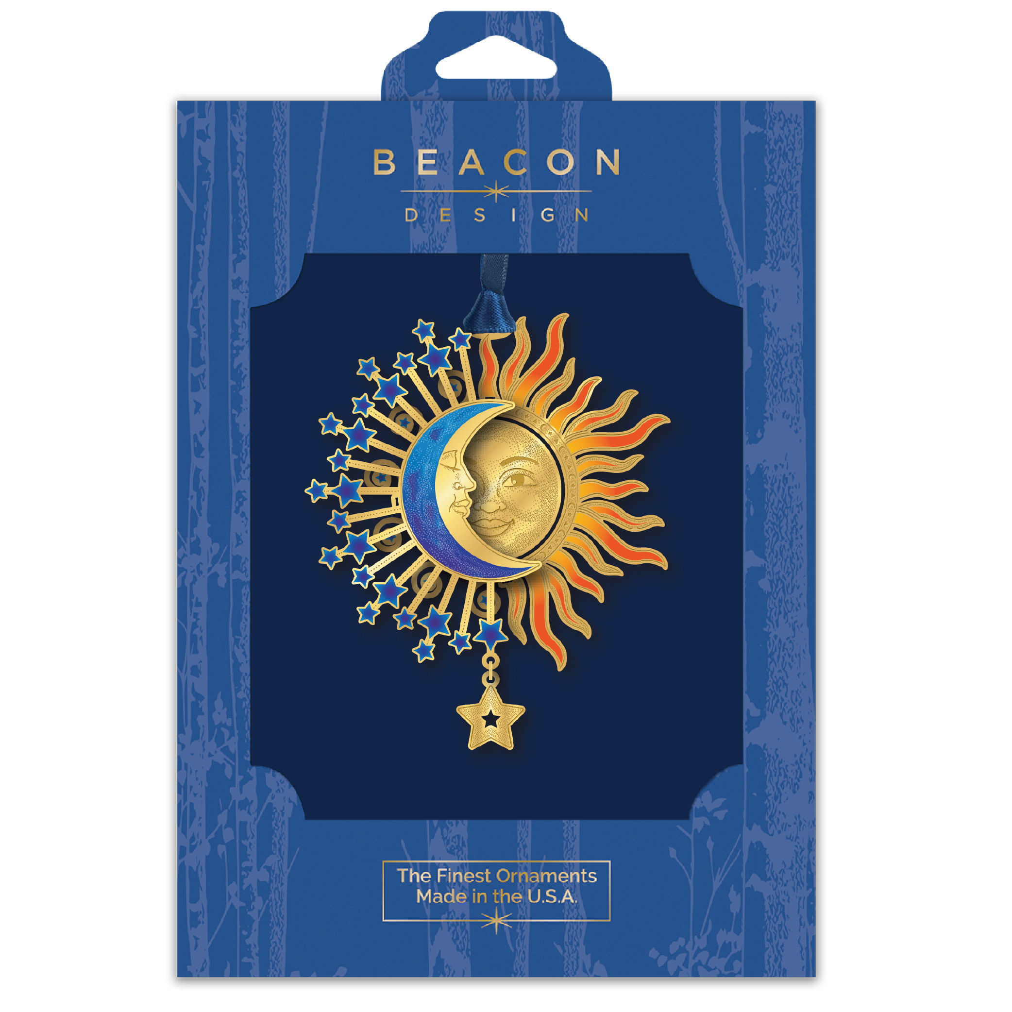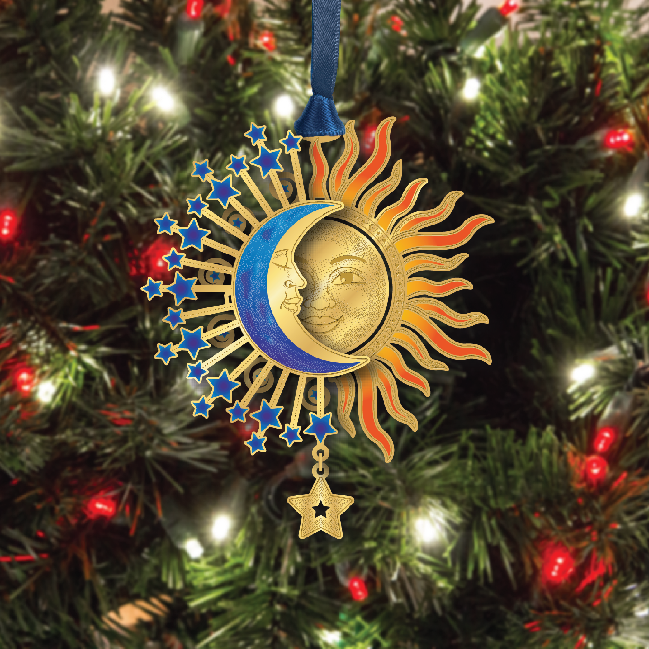 This beautiful Sun & Moon Crescent ornament features a 24K gold sun set behind a nicely colored crescent moon with a hanging star.